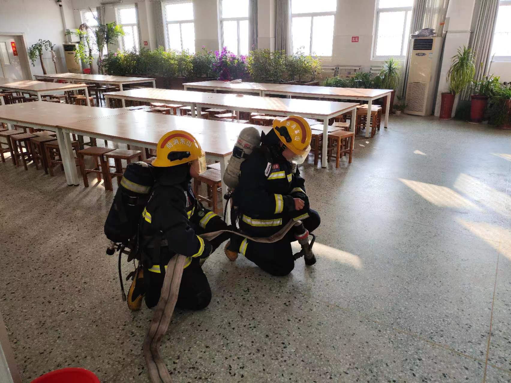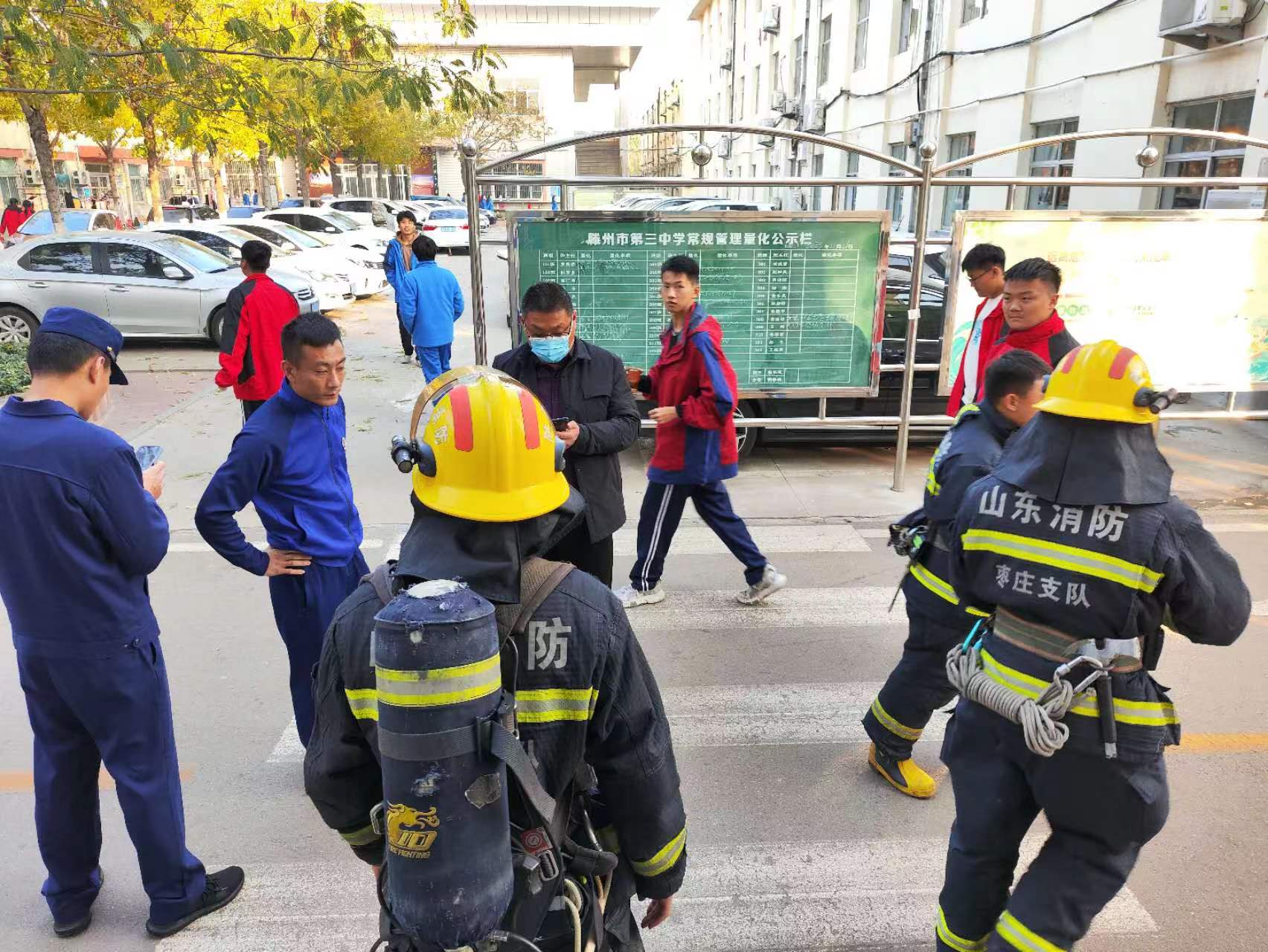 9.组织一次消防演练活动。11月21日联合滕州市善国消防站开展一次消防演练,模拟阅览室、宿舍出现火情,组织物业、保安、食堂以及学生代表进行一次模拟消防演练活动。