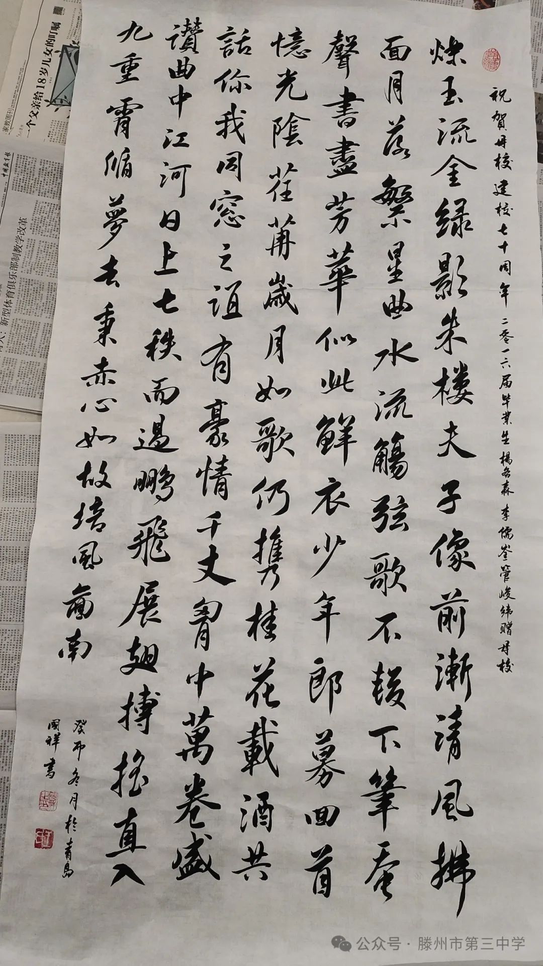 金龙献瑞,绿柳迎春;七十芳华,芝兰树蕙。自校庆一号公告发布以来,各级领导大力支持,教育同仁拱手相庆,万千学子情牵母校,四方校友云集响应。或挥毫泼墨书写美好祝愿,或致电致信言说师生之情,或下笔成文记录流金岁月,或寄来旧物充实校史资料……各种形式的祝福,各种形式的支持,学校均已收到。在此,滕州三中70周年校庆筹备办公室向各位校友、同仁致以崇高的敬意和衷心的感谢!